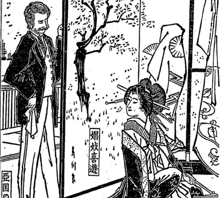 夷人の相手はさせないと約束したにもかかわらず、岩亀楼の主人は金に目が眩んで喜遊を説得しようとしますが、喜遊が頑なに断るので、伊留宇須には病気だと言い訳を続けます。伊留宇須は「情欲の尚耐えがたく」夜毎に岩亀楼にきて大金を使い、喜遊に会わせてくれれば更に大金を積むと訴え、岩亀楼の主人は、横浜で外国人の怒りに触れると店がたちいかなくなる;異人といえども禽獣ならず;横浜の婦人は「娼妓はもとより素人にても彼らの妾となる者多きは名を取るよりも利を得るを当世なりと思うが故」だと喜遊を説得します。